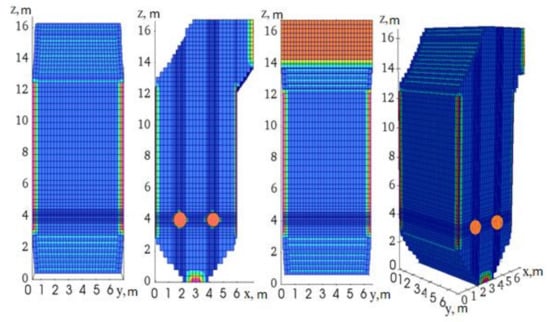 Table 4. The system of Equation (1) is a composition of four components: convective, diffusion, dissipative and source. This system has no analytical solution and can only be solved numerically. We have chosen the control volume method, which is often and successfully used for the numerical solution of differential equations describing complex processes of heat and mass transfer in the furnace of power boilers [
