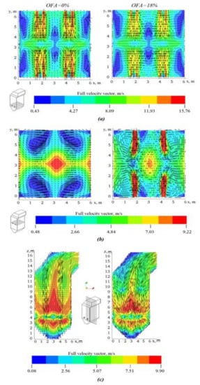 For the case OFA = 18%, the flows directed from the injectors, after the collision, are additionally cut into two vertical vortices above the zone of the burner installation (