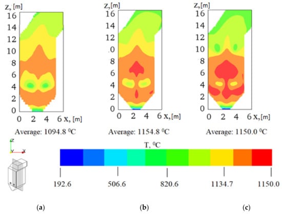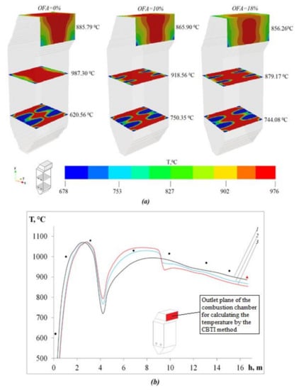 Figure 9a). However, the more additional cold air is supplied through the injectors, the lower the average temperature value in the zone of the injectors becomes OFA = 0%, T = 987.30 °C; OFA = 10%, T = 918.56 °C and OFA = 18%, T = 879.17 °C.