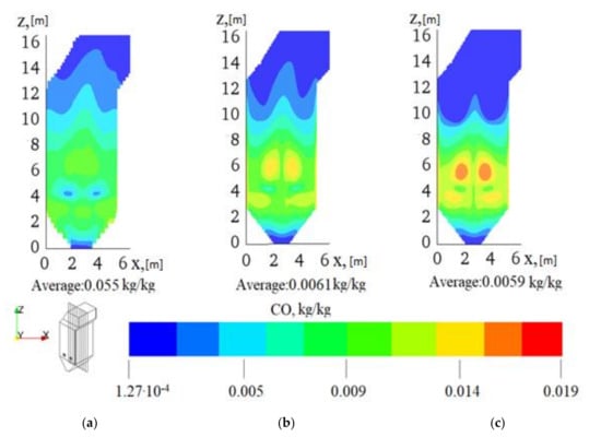 Figure 10 illustrates the distribution of the concentration of carbon monoxide CO in the central (y = 3.3 m) section of the furnace of the BKZ-75 boiler for the base case (OFA = 0%) and using the two-stage fuel combustion technology (OFA = 10% and OFA = 18%). A decrease in CO concentration can be noted as one moves towards the outlet from the furnace. Carbon monoxide is concentrated mainly in the zone of the main distribution of the fuel flow and oxidizer (air) from the burners, i.e., where fuel carbon is abundant.