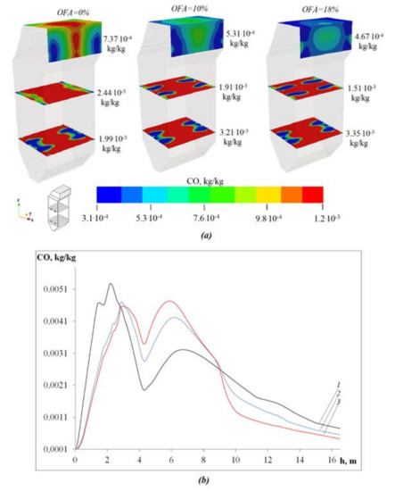 Figure 11 shows a three-dimensional (a) and two-dimensional (b) distribution of the average values of the concentration of carbon monoxide CO along the height h of the furnace for three cases of the implementation of the technology of two-stage combustion in the furnace of the BKZ-75 boiler: OFA = 0% (basic variant), OFA = 10% and OFA = 18%. Indeed, an increase in the volume of air supplied through the injectors leads to a decrease in the concentration of CO in the exhaust gases and at the outlet from the combustion space (