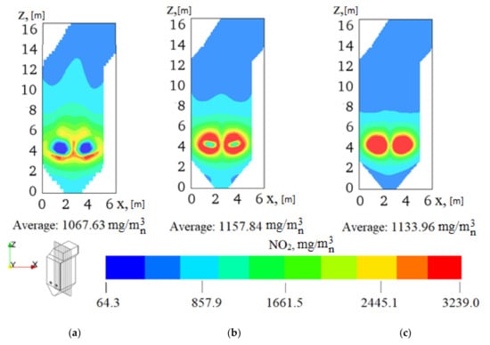 2 in the central (y = 3.3 m) section of the furnace of the BKZ-75 boiler for three options for supplying additional air through the injectors: (a) OFA = 0% (basic version), (b) OFA = 10%, (c) OFA = 18%. Analysis of