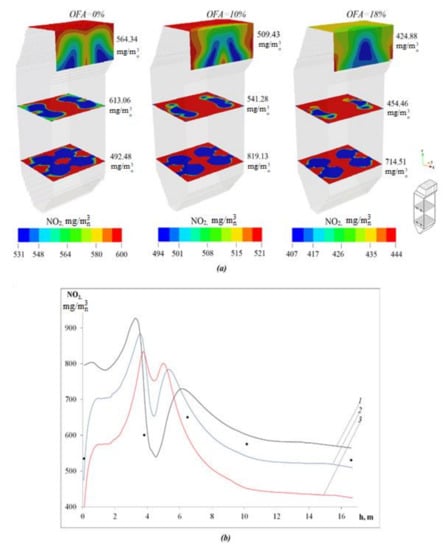 Figure 13a,b, curve 3), which is primarily associated with a decrease in temperature in this zone of the furnace. All this indicates a significant effect of the two-stage fuel combustion technology on the distribution of the concentration of solid fuel combustion products in the furnace and at the outlet from it.