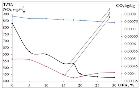 Comparing the basic regime (traditional combustion, (OFA = 0%) of operation with the regime when additional injectors are switched on, it can be noted that the highest concentrations of nitrogen dioxide NO