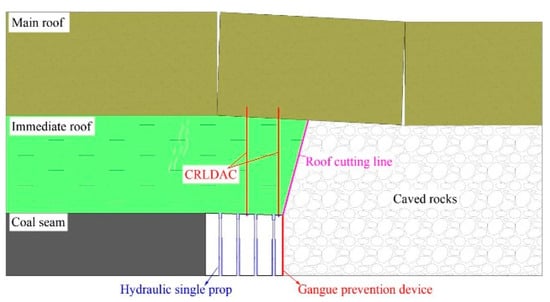Retained gob-side entry by roof cutting (RGERC) is a new gob-side entry developed in recent years. It retains the advantages of traditional gob-side entry retaining (GER) technology, such as removing the coal pillar, dual use of one entry, and continuous mining [1,2,3]. Based on the idea of actively controlling the roof structure of the roadway and optimizing the stress environment of the surrounding rock, the constant resistance and large deformation anchor cable (CRLDAC) was adopted to strengthen the roadway roof, and the directional pre-split blasting technology was invented to cut off the roadway roof. In order to avoid the influence of mining-induced pressure, roof reinforcement support and directional pre-split blasting should be carried out in order at a certain distance in front of the working face. When the working face is advancing, the temporary support structure should be arranged in the retained roadway in time to offset the impact of gob roof collapse on the roadway roof, and control the continuous deformation of the roadway roof after the gob roof collapses. Because an artificial fracture plane is formed in the roadway roof by directional pre-split blasting, the gob roof will collapse along this plane, and the roadway roof will be retained and form a short cantilever beam structure [4]. The surrounding rock structure of RGERC is shown in Figure 1. The caved rocks formed by the fractured roof provide support for the overlying roof strata with its bulking effect, which promotes the overlying strata to be stable. The roof structure of the roadway has been changed and the coal pillar and backfilling wall have been canceled because of the incorporation of RGERC technology, thereby optimizing the stress environment of roadway surrounding rock and improving the cost and effect of the retained roadway.