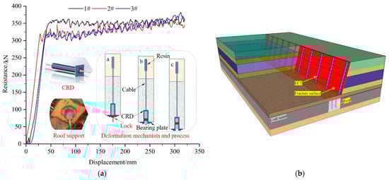 Mechanical schematic of CRLDAC and roof pre-split blasting: (a) mechanical properties and supporting principle of CRLDAC and (b) 3D profile of roof cutting in RGERC.