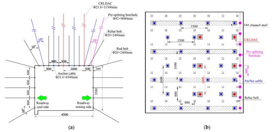 16011 panel is the first panel of the West 6 district in Zhaogu No.1 mine. The panel is 205 m wide along the dip and 650 m along the strike. RGERC was applied in the 16011 tail entry, which is located in the upper coal seam. The width and height of the roadway are 4500 mm and 3500 mm, respectively. The roadway roof support is mainly composed of the CRLDAC, anchor cables, and rebar bolts. The length of the CRLDAC is 11,300 mm, and the pattern is 1600 × 1600 mm². Directional pre-split blasting is adopted to accomplish the work of roof cutting. The designed roof cutting depth is 9000 mm, and the borehole slopes at an angle of 15° to the vertical. The detailed parameter of roadway support is shown in Figure 4.