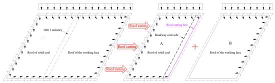 If the roof strata of the coal seam before roof cutting can be regarded as a rectangular elastic thin plate fixed by a solid coal seam all around, then each rock layer becomes a stable transferring and bearing layer of the overburden. The internal stress distribution of the rock layer is uniform, and the pressure relief area is only formed within a certain range of the roadway surrounding rock after roadway excavation, and the roof structure does not change. However, after roof cutting, the roof structure is transformed into a composite structure composed of two parts (A and B), as shown in Figure 5. Part A is the roof of the roadway and the coal seam beside the roadway coal side, which can be regarded as the thin plate with three sides fixed and one side roller supported. Part B is the working face roof, which can be regarded as the thin plate with two sides fixed and two sides roller supported. Therefore, it can be inferred that roof cutting will significantly affect the structural continuity of the roadway roof strata, which will inevitably lead to the stress transfer and asymmetric distribution of surrounding rock stress.