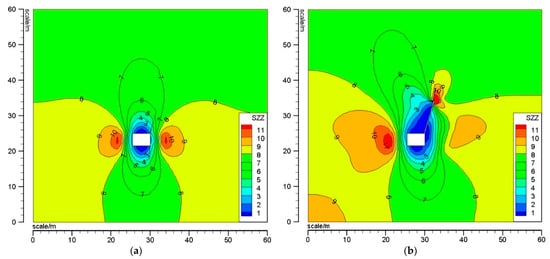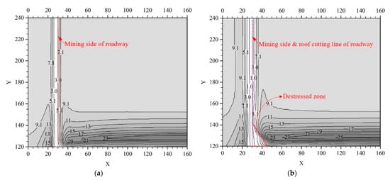 By comparing Figure 6b with Figure 6a, it is found that after roof cutting, the peak stress of the stress concentration area in the working face is reduced and the area is shifted to the deep and upper coal seam. At the same time, the stress concentration appears at the top of the blasting induced crack, and the maximum stress exceeds 11 MPa. However, in the coal seam beside the roadway mining side, the stress concentration area expands and shifts to the deep coal seam after roof cutting. The range of the pressure relief zone in the roadway roof is significantly increased, and the roadway roof stress within the height of roof cutting is generally below 3 MPa. In addition, the roadway floor strata is also relieved.