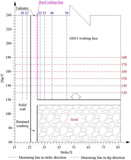 In order to study the influence of roof cutting on the magnitude and distribution of front abutment pressure, several measuring lines were arranged in the coal seam on both sides of the roadway in front of the working face. The layout scheme of the measuring lines is shown in Figure 7. The distribution and variation of front abutment pressure on the strike and dip were monitored under the conditions of roof cutting and no roof cutting. A total of 6 measuring lines were arranged on the strike: 2 were located in the coal seam on the left side of the roadway, and the distance between the measuring lines and the roadway were 2.5 m and 5.5 m, respectively. The other 4 were located in the coal seam on the right side of the roadway, and the distance between the measuring lines and the roadway were 2 m, 5 m, 10 m, and 20 m, respectively. In addition, 6 measuring lines were also arranged along the inclined direction of the working face, and the distances between the measuring lines and the coal wall of the working face were 10 m, 20 m, 30 m, 40 m, 50 m, and 60 m, respectively.