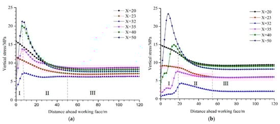 The working face was mined in the model, and the variation of vertical stress on the measuring line in front of the working face was monitored and recorded. After the vertical stress caused by coal seam mining tended to be stable, the monitoring data was extracted, and the distribution of the front abutment pressure was analyzed. Figure 8a,b shows the distribution of front abutment pressure on the strike under the condition of no roof cutting and roof cutting, respectively. If the roadway roof was not split, the front abutment pressure on the left side of the roadway decreased with increased distance from the coal wall of the working face. The front abutment pressure on the other side increased rapidly in zone I and reached the peak value soon, then decreased gradually in zone II and tended to be stable in zone III. The length of zone I and II were 8 m and 42 m, respectively, and the sum (50 m) of their lengths was the length of zone influenced by front abutment pressure.