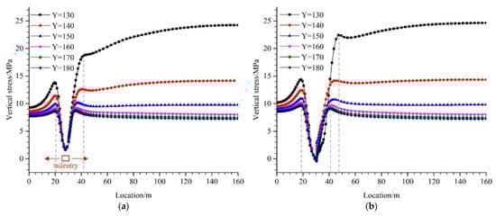 Figure 9a,b show the distribution of side abutment pressure at different positions in front of the working face under the conditions of no roof cutting and roof cutting, respectively. By comparing the two figures below, it was found that the side abutment pressure on both sides of the roadway showed the distribution characteristics of increasing rapidly at the beginning, then deceasing after reaching the peak value and reaching a stable state quickly with the increase in distance from the roadway. Roof cutting moved the peak of the side abutment pressure on both sides of roadway into the deeper part of the coal seam, but had little influence on the magnitude of the peak and stable value of the side abutment pressure. To sum up, roof cutting can promote the high side abutment pressure to transfer to the position away from the roadway and optimize the stress environment for roadway surrounding rock.