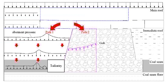 Stress change in roadway surrounding rock is attributed to mining-induced overlying strata movement, and the roadway roof is a load transfer structure of stress from the overlying strata to the roadway surrounding rock [28]. After the immediate roof behind the shields collapses, the caved rocks are loosely heaped up in the gob. As a result, the overlying rock strata loses effective support from the direction of the mined-out area, which inevitably causes asymmetric stress transfer when the overburden load is transferred downwards. There are two main paths of the stress transfer.