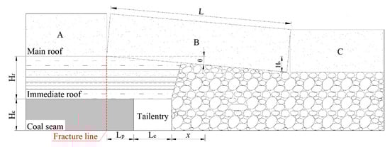 where Le is the roadway width, Hi is the subsidence of rock block B at the roadway mining side, and Lp is the horizontal distance between the fracture line of the main roof and the roadway coal side and can be expressed as follows [30]: