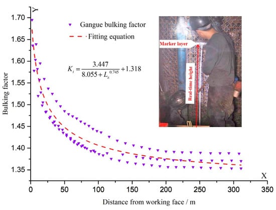 The variation of the bulking factor of the caved rocks at the roadway mining side with respect to the distance behind the working face was plotted as illustrated with scattered data in Figure 13. As a result of a 2D regression analysis, the best curve fit to the data obtained can be expressed with the following equation: