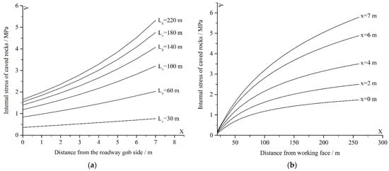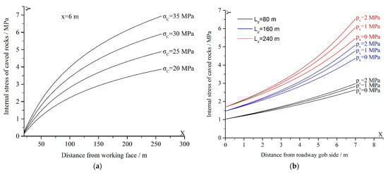 The internal stress distribution for the initial compressive strength from 20 to 35 MPa for a constant distance from the roadway mining side of 6 m was determined for the caved rocks by using Equation (8). As Figure 15a shows, with the increase of the initial compressive strength of the caved rocks, the internal stress of the caved rocks gradually increases. Considering that the initial compressive strength of the caved rocks is mainly determined by the lithology and bulking factor of the immediate roof strata, for a specific lithology, the technology of loose blasting can be adopted to reduce the fragmentation of the caved rocks so as to increase the initial compressive strength of the caved rocks. Figure 15b shows that the effective support of the roadway coal side can promote the transfer of the overburden load to the gob, and this promotion effect is constantly enhanced with the advancement of the working face. Therefore, the effective support of the roadway coal side is also indispensable.