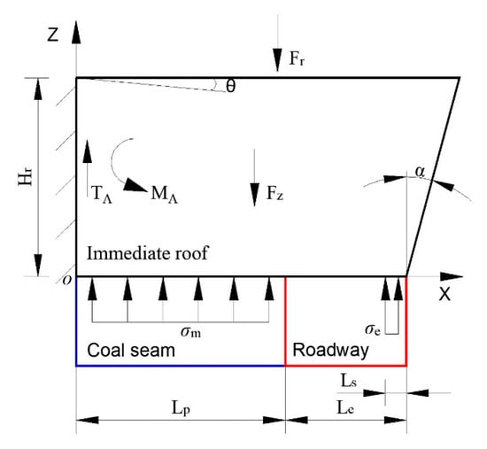 where Mm, Me, Mz, and Mr are the moments of stresses σm, σe, Fz, and Fr to point O, respectively, Ls is the width of the roadside support, and σtl is the tensile strength of the immediate roof.