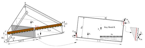 The mechanical analysis of key rock block B is carried out. Actually, the main roof strata break periodically in the form of “O-X” with the advance of the working face so that the main roof block above the roadway presents an arch-triangle block structure. The mechanical model of the arch-triangle block is shown in Figure 17. Key rock block B rotates around arbitrary line GH and subsides to the gob. The planes BCFE, ABED, and HGA’C’ are the contact planes between rock block B and adjacent rock blocks. Through the interaction between the rock blocks, rock block B is subjected to pressure TCB and TAB, and shear force FCB and FAB from blocks A and C, respectively.