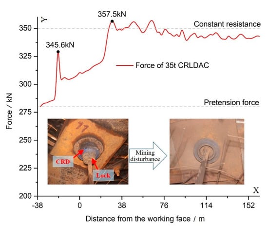 As shown in Figure 18, the installation position of the CRLDAC was 38 m in front of the working face, and a pretension of 282 kN was applied immediately after the installation. Then, due to the implementation of the advance directional pre-split blasting, the resistance force of the CRLDAC increased rapidly and then dropped. Therefore, the role of the CRLDAC in absorbing dynamic impact energy and ensuring the stability of support system was verified. As the working face continued to advance, the resistance force of the CRLDAC increased steadily and reached the peak value at 25 m behind the working face, which exceeded the design constant resistance of the CRLDAC by 350 kN. After that, the resistance force of the CRLDAC began to fluctuate around the constant resistance value, and at the same time, the CRLDAC deformed constantly to adapt to the roof subsidence and absorb the energy of the roof deformation