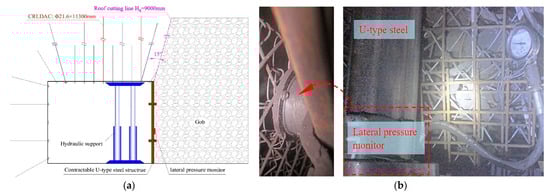 Under the pressure of the main roof blocks and overlying strata, the caved rocks in the gob may flow into the roadway if no restriction measures are taken. Therefore, considering the characteristics of large mining height in the 16011 working face, a retractable U-type steel structure was invented to constrain and shape the caved rocks beside the roadway so that the caved rocks in the gob formed a new roadway gangue side automatically. Although there is difficulty in directly monitoring the internal vertical stress of the caved rocks in the gob, we can monitor the lateral pressure between the caved rocks and the retractable U-type steel to study the evolution of the internal stress of caved rocks [35,36,37]. The layout and installation of the lateral pressure monitor are shown in Figure 19.