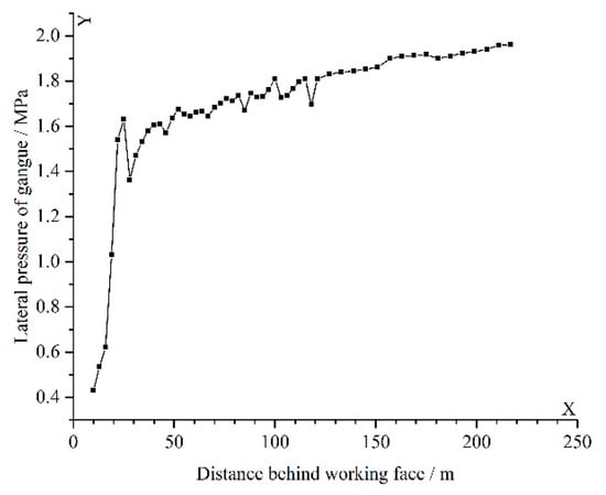The monitoring curve of the lateral pressure on the gangue side of the 16011 tail entry is shown in Figure 20. When the distance behind the working face was 10–25 m, the lateral pressure of the caved rocks increased rapidly. When the distance behind the working face reached 25 m, the lateral pressure of the caved rocks reached 1.63 MPa, and then the lateral pressure plunged to about 1.35 MPa. With the advance of the working face, the lateral pressure of gangue began to increase continuously and slowly. It is speculated that the main roof strata or thick roof strata ruptured or collapsed at the position of 25 m behind the working face, and then the fluctuation of the lateral pressure was mainly caused by the change in the contact area between the caved rocks and the pressure monitor induced by the fragmentation change in the caved rocks. With the bulking factor of the caved rocks gradually stabilized, the fluctuation of the gangue lateral pressure also decreased significantly. When the distance behind the working face exceeded 200 m, the gangue lateral pressure reached 1.93 MPa and continued to increase slowly. According to the results of the above theoretical analysis, the vertical stress in the caved rocks 200 m behind the working face was 5.35 MPa, so the lateral pressure coefficient of the caved rocks here was 0.36.