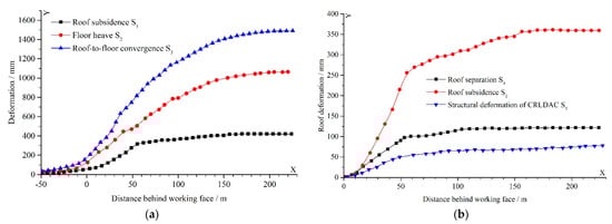 Deformation of the roadway surrounding rock and the supporting structure: (a) deformation of the roadway roof and floor and (b) deformation of the roof strata and CRLDAC.