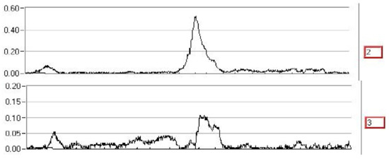 This method allows for the detection of all imperfections and defects of the stator core, regardless of their position. The measuring and position transducers are placed on a trolley that moves along each stator notch, thus scanning the entire core. On the screen through LabVIEW, the transducer position inside the stator is observed, and the state of sheets is recorded. Figure 4 shows the spectra recorded in three notches for the flow variation by 10%. The existence of defects in stator iron may be observed.