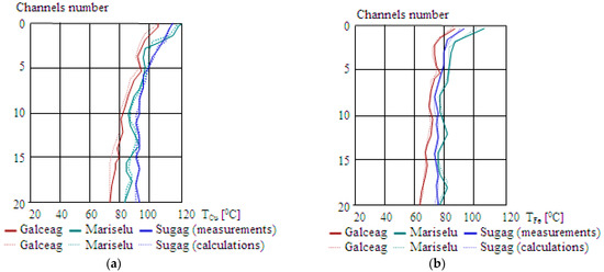 The generator from the power plant Sugag has a constructive modification of the stator which produces its heating. The output airflow rate from the pressing zone is obstructed, so in front of the radial channel, the air velocity is higher compared with values recorded in other stator channels. Figure 5a,b illustrates the temperature distribution in stator’s copper and iron, based on its variation in the air gap [28]. The obtained values by numerical modeling are compared with the experimentally recorded data. The temperature in the air gap was chosen for measurements because this air practically cools the stator.