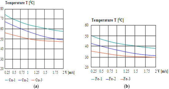 Finally, some of the obtained results for the Gâlceag generator are illustrated below. Figure 9a illustrates the dependence between the stator’s iron and copper heated parts from the first three sheets packages and the temperature from the air-gap, and Figure 9b shows the variation of the cold air velocity with temperature from the air-gap. The package number is noted with one, two, and three. During the measurements, the high values of air velocities were also tested. Even so, temperature variation tends to remain almost at the same saturated value, no matter how the air velocity increases. For doubled air velocity in the first two channels, the heating of the stator copper decreases compared with the first package of stator lamination only by 6 °C, and in the stator’s teeth of the stator, in the same packet of lamination, the temperature drops by only 3 °C. In the case of stator iron, the phenomenon is even clearer because the temperature drops by only 3 °C in the same packet of laminations.