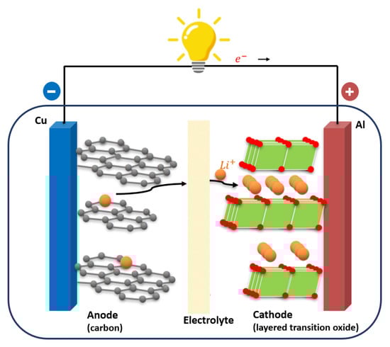 Most commercially available LIBs consist of a carbon-based intercalation anode and a cathode utilizing mixed lithium transition metal oxides or olivine compounds. The most widely used cathode materials are the lithium transition metal oxides, lithium cobalt oxide (LCO), lithium nickel cobalt manganese oxide (NMC), lithium nickel cobalt aluminium oxide (NCA), and lithium manganese oxide (LMO) and the olivine lithium iron phosphate (LFP) []. These cathode and anode compounds are typically mixed with small quantities of a polymeric binder (e.g., polyvinylidene fluoride) and conductive agents (e.g., carbon black) and printed onto a metal current collector (aluminium for the cathode and copper for the anode).