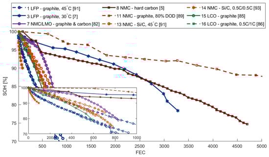 The capacity degradation as a function of FEC from different reviewed cycle life studies are presented in Figure 3. All presented studies use commercial LIB and cycle with a C rate (charging/discharging) of 1 C/1 C, within a SOC window of 0–100% and a temperature of 25 °C unless specified otherwise in the legend. The cathode and anode material are specified in the figure legend, more details are presented in Table 1. The studied batteries are numbered to simplify referencing. All studies use a climate chamber for temperature regulation (except []) without further specifying the cooling strategy. It is noticeable that three studies report a significantly slower degradation of the observed batteries (3, 8, 11) than all others (1, 7, 13–16). The slower degrading batteries are those using a NMC cathode and a carbon anode without silicon and LFP/graphite. A SOH of 80% and thus the defined end of life for automotive applications was reached after nearly 3150 FEC for LFP/graphite (3) and 4000 FEC for NMC/hard carbon (8). The NMC/graphite (11) reached more than 8800 FEC, but it has to be noted that this battery was cycled with a reduced DOD of 80%. The NMC/hard carbon (8) shows a drop in SOH around 500 FEC and a further steady decrease in SOH afterwards. The SOH of the LFP/graphite (3) drops to around 3000 FEC. The other study on an LFP/graphite (1) presented in the figure shows a significantly faster capacity degradation. A SOH of 80% is already reached after 600. Both studied batteries are cylindrical but the better performing battery (3) has 2.3 Ah, while the other only has 1 Ah. Although, the most significant difference is the ambient temperature during operation. The faster degrading battery was operated at 45 °C, while the other was operated at 30 °C. The other batteries with significantly larger degradation rate are NMC/LMO blend with carbon anode (7), NMC with Si/C (13, 14) and the LCO/graphite (15, 16). The NMC/LMO blend with carbon anode (7) has a slow degradation rate for the first 500 FEC before the capacity starts decreasing quickly, reaching a SOH of 80% around 800 FEC.