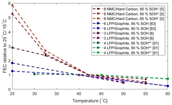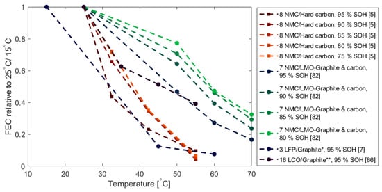 Capacity fade during cycling as a function of temperature. NMC/Hard carbon (8) [] and NMC/LMO- Graphite & carbon [] relate to 25 °C, charging and discharging rate of 1 C and 100% DOD. LCO/Graphite (16) [] similarly, but with a charging rate of 0.5 C. LFP/Graphite (3) [] relates to 15 °C, discharge rate 0.5 C and data summarized for DOD of 10 to 90%. Linear segments that connect data points for visual orientation.