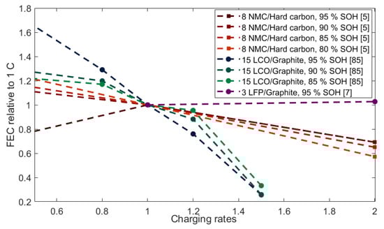 Figure 5 illustrates the accelerated capacity fading due to an increased charging rate. Moreover, the y-axis represents how many cycles one can expect at a given C rate relative to 1 C, with all other conditions unchanged. Generally, the chemistries with the poorest ageing properties are also the ones most sensitive to rate changes. When increasing the charging rate from 0.5 C to 1.5 C for the LCO battery, a SOH of 85% is reached after only 30% of the FEC. However, initial accelerated ageing for a C rate of 0.5 C as a 95% SOH is already reached 20% faster. The accelerating effect of the C rate on degradation is even more significant at the beginning of cycling. For the battery with the NMC cathode, the effect of the charging rate increases with ageing. Only around 50% of the FEC can be realized before reaching a SOH of 80% when increasing the charging rate from 0.5 C to 1.5 C. It is noticeable that while dependency on charging rate for NMC seems to be linear, the dependency for the LCO is higher when charging rates of 1 C and higher are reached. For the battery with LFP cathode, an increase of the C rate from 1 C to 2 C seems to have nearly no effect.