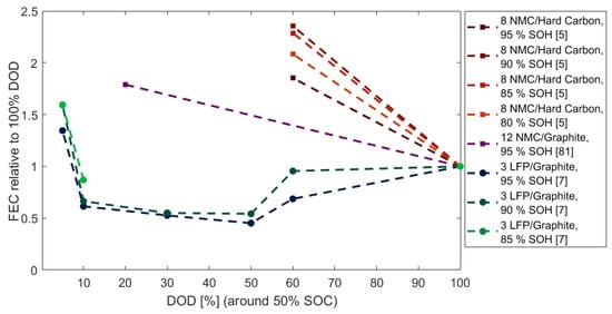 Figure 6 shows the amount of FEC for different SOC windows around a SOC of 50% relative to a SOC window of 0–100%, which was the only common point of reference. The batteries with NMC cathode benefits from decreasing the SOC window. When decreasing the SOC window from 0–100% to 20–80%, a SOH of 95% is only reached after nearly 2 times the amount of FEC. A further decrease to 40–60% seems to bring no further improvement. The battery with the LFP cathode shows a complex relationship between SOC window and capacity degradation with plateaus between the DOD of 100% to 60% and 50% to 10%. Decreasing the SOC window from 0–100% to 25–75% bisects the amount of FEC that can be realized until a specific SOH. A further decrease in the SOC window until 45–55% has no additional effect. The voltage window of a LFP cathode is more narrow than other cathodes. It never reaches as high a voltage as NMC etc., which are especially critical for the stability. This explains why a decrease in the SOC window is not beneficial.