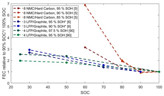Cycle life studies look at battery degradation when continuously cycled. For the evaluation, the amount of cycling is quantified in different ways. Some studies look at the number of cycles defined as one charge and one discharge until specified cut-off voltages [,,] or the degradation to the time that the battery is cycled [,]. Other studies relate the current cycle capacity to the original cell capacity. This method is applied using the terms normalized cycles [], full equivalent cycles [] or equivalent full cycles []. This method will be referred to as full equivalent cycles (FEC) in the following. To compare ageing data from different studies, the cycling time and the number of cycles were calculated to FEC. The cycling time was converted to FEC by multiplying with half of the C rate as the C rate is the rate at which a battery is discharged relative to its initial capacity (a C rate of 1C means that the discharge current is equivalent to that of discharging a battery from 100% to 0% SOC in 1 hour, e.g., from 70–20% SOC in half an hour). The number of cycles was converted to FEC by multiplying the cycle number with the depth of discharge (e.g., 80% in case of a SOC window of 10–90%) and integrating the capacity loss over the number of cycles using a linear regression between two measurement points. When evaluating degradation characteristics batteries are cycled in different SOC windows (e.g., 20% to 80% SOC) or stored at a specific SOC. Some studies use the term Depth of Discharge (DOD) instead of SOC. The DOD can either be given from 100% SOC, so that e.g., 60% DOD is equal to a SOC window of 40% to 100%, or DOD can be given around 50% SOC, so that e.g., 60% DOD around 50% is equal to a SOC window of 20% to 80% SOC (as one utilises 60% around a reference SOC at 50%) [].
