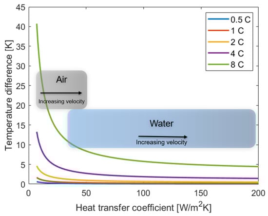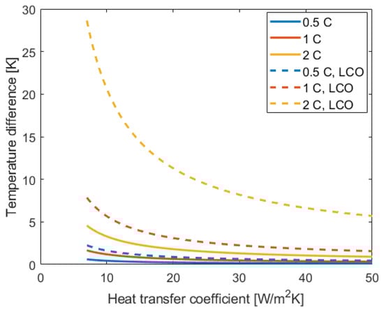 Numerical simulations can simulate the thermal behaviour of the whole batteries and can be fitted to different conditions and geometries by alternating model parameters. The models can be classified into two major categories according to the underlying mathematical model. A first category is a multiphysics approach where a thermal model is mostly coupled with an electrical model (based on an equivalent circuit) [,] or an electrochemical model [,]. The second category is a purely thermal model based on solving the energy balance and heat generation equation with the respective boundary conditions. Bernardi et al. [] presented one of the first thermal models by deriving a general energy balance for battery systems with heat generation due to phase changes, enthalpy of mixing and enthalpy of reaction consisting of heat due to overpotential, ohmic heating and entropic heat. They showed that a simplified form, where the heat generation due to phase changes and enthalpy of mixing is neglected, is valid for most systems. The heat is transferred inside the battery by conduction and therefore determined by the thermal conductivities of all components.