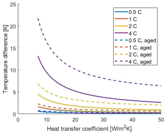 In addition to the discussed, other factors like fabrication parameter, electrolyte composition and thermal management strategy have been shown to have an impact on both the performance and degradation of LIB. The fabrication process parameter determine the mesostructure of the electrode materials which is characterized by the spatial location of the active material particles, carbon additive and binder, contact between electrode material and current collector etc. Fabrication process parameters that have been among others shown to have a large impact on the performance are coating of active particle [], slurry composition [], calendaring of electrodes []. Electrolyte additives are used to improve the performance and lifetime of LIB. Additives are mostly utilized to improve the SEI formation, protect the cathode, stabilize the LiPF salt and therefore have a significant impact on the degradation behavior [,,]. As all reviewed studies have been conducted with commercial cells, details on fabrication parameter and the electrolyte composition were not disclosed and therefore outside the scope of this review. While all reviewed studies report the type of climate chamber used for the study, settings like fan speed are not specified. To elude more on the importance of the cooling strategy for the comparability of the ageing studies, simple thermal simulations have been conducted and used for further evaluation of the reviewed literature data.