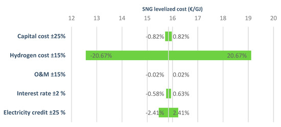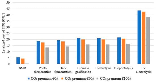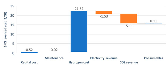 22] presented a comprehensive study of the power-to-gas route including detailed economic calculations. In this work, usage of the surplus power available in the national power grid to power an electrolyzer for hydrogen production was considered. Considering several products as energy carriers (e.g., hydrogen, methane), the possibility of returning the power extracted and stored in the form of a gas to the power grid when power demand is high was evaluated. The paper shows promising results for the economics of the proposed plants, however, a major contributor to the cost of the energy obtained and stored in this manner greatly depends on the initial cost of the power used in the electrolyzer. In their calculations, they assumed free power from the peak-shaving. When a low electricity price is considered, production prices increase significantly. Buchholz et al. [