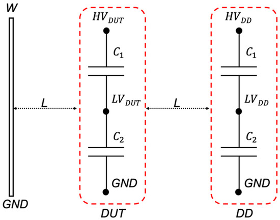 In this work, the SC modeling is based on a measurement setup defined in the IEC standard [8] to evaluate the immunity of CDs. Such a setup is schematized in Figure 2 and it consists of the following: (i) a grounded wall indicated with “W”; (ii) the HV divider under test indicated with “DUT” and another identical HV divider used as a dummy divider for the tests, indicated as “DD”.