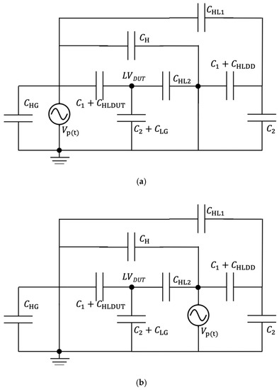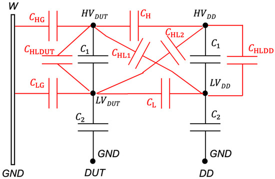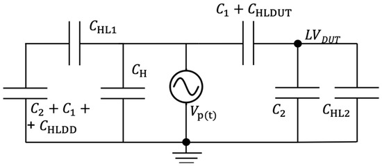 The SCs, as shown in Figure 3, are listed and described in Table 1 for the sake of clarity. Regarding and , the “*” is to highlight that when the HV is shared between the dividers, as in one of tests described by [8], they do not exist. However, for a complete scenario that includes tests in which the two HVs may be different or with different phases, they have been included in the equivalent circuit.