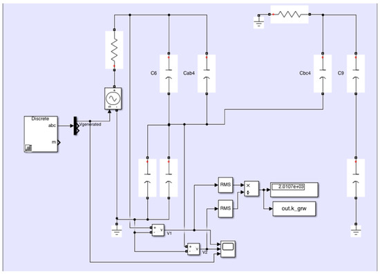 In addition to configurations T1–T3, which are simulated to numerically confirm the results of the circuital analysis, further configurations are implemented in the Simulink environment. Such configurations replicate experimental ones that were not used to derive the SC values but for which the ratio errors were measured. Hence, they are used as benchmarks to assess if the obtained SCs can be used to predict the ratio errors in those situations. These new configurations are referred to as T4, T5, and T6. Configuration T4 is identical to T2 but without the grounded wall W; configuration T5 instead is identical to T2 but the DD is fed with a voltage of the same amplitude but with 180° phase shift as compared with the voltage applied to the DUT. Finally, configuration T6 is identical to T5 but without the presence of the grounded wall. Furthermore, all configurations T1–T6 have been tested and simulated by applying 100%, as well as 80% of the rated voltage , as defined in [8]. This further test has been done to verify that the amplitude of the applied voltage does not affect the model of Figure 8 and the accuracy of a CD. Hence, this test confirms that the SC expressions are not influenced by the voltage amplitude, which, at the same way, does not influence the real in-lab test accuracy measurements.