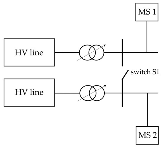 Simplified scheme of an example of an HV/MV (High Voltage/Medium Voltage) substation equipped with two measuring systems, i.e., MS1 (Measurement System 1) and MS2 (Measurement System 2), installed at the MV (Medium Voltage) busbars.