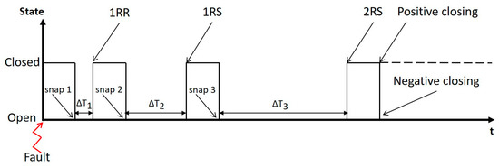 The time aggregation of the multiple sags discussed in point 3) was conducted appropriately by selecting the time intervals in the function of the actual protection characteristics installed in the analyzed MV networks. Due to the collaboration with E-Distribuzione S.p.A, it was possible to consider the characteristic time intervals of the protections of the MV lines equipped with an automatic reclosing device, known as DRA (Dispositivo di Richiusura Automatica, in Italian, or Automatic Reclosure Device, in English). Figure 2 shows that the protection system acts with four consecutive snaps and three reclosures after a fault: a first rapid reclosure (1RR in Figure 2) and two successive slow reclosures (1RS and 2RS in Figure 2).