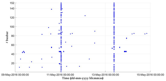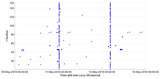 As an example, Figure 3 and Figure 4 report the scatter plots of the data measured from December 2015 to December 2016 before and after the aforementioned time aggregation, respectively. Every point in the figure represents a voltage sag that occurred at the site, which has the number along the y axis, in the day along the x axis. The figures provided the first qualitative proof that the time aggregation did not affect the main characteristics of the sags. In particular, it was important that the first manipulation of the data did not remove any simultaneous sags among the sites and did not modify the distribution of the sags over time at each site. The simultaneous sags corresponded to the vertical lines of dots in Figure 3 and Figure 4; the distribution at each site over time, dense or sparse, was derived by the dots in the same horizontal line.