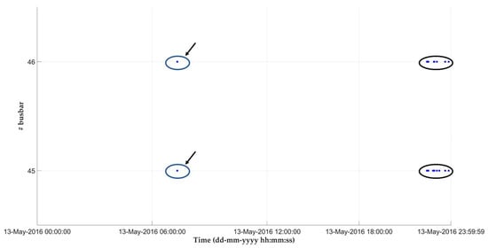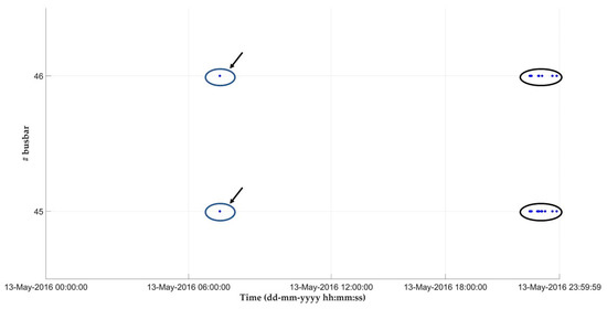 Figure 5 and Figure 6 present the zooms of Figure 3 and Figure 4, respectively, on only one day (13 May 2016) applied to only two sites, i.e., sites #45, and #46. The zooms allowed the simultaneous sags to be ascertained, and they were measured at these after 06:00 a.m. These sags were present before the time aggregation (as indicated in Figure 5 by the arrows), and they also were maintained after the time aggregation (as indicated by the arrows in Figure 6). Further, the zooms indicated that the distribution of the sag was not modified over time by the time aggregation. In fact, comparing the sags in Figure 5 with those in Figure 6, it was evident that the sags were distributed in both figures as rare sags (blue circles) and clusters (black circles).