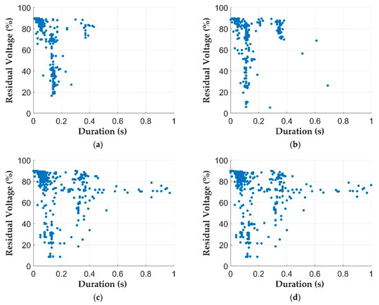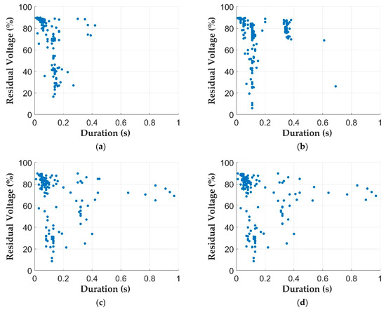 Scatter plots (Residual Voltage, Duration) of the voltage sags measured in 2014, 2015, and 2016 at the site #20: (a), site #44: (b), site #74: (c), and site #75: (d), before time aggregation.
