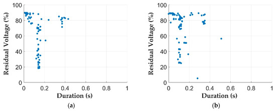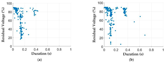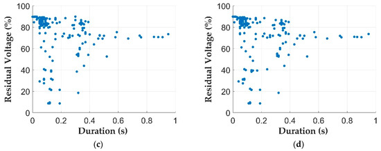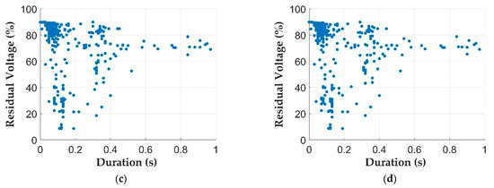 Figure 14 and Figure 15 show the scatter plots of the rare voltage sags and the clusters, respectively, obtained after the application of the 1h-filter on the voltage sags measured from 2014 to 2016 at sites #20, #44, #74, and #75, which are the same sites of the scatter plots in Figure 12. Comparing these plots with those reported in Figure 12, it is evident that a great part of the clusters was filtered out, even if some points in the scatter plots of the rare sags (Figure 14) still remain close to the x axis. This evidence represented the first critical aspect of this initial study. The 1 h-filter, applied to every site in the same way, caused a non-optimal detection of the clusters.