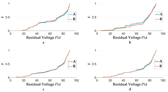 Cumulative distribution function, F, of the residual voltage of voltage sags measured in 2014, 2015, and 2016 at sites #20: (a), #44: (b), #74: (c) and #75: (d), A before time aggregation and B after time aggregation.