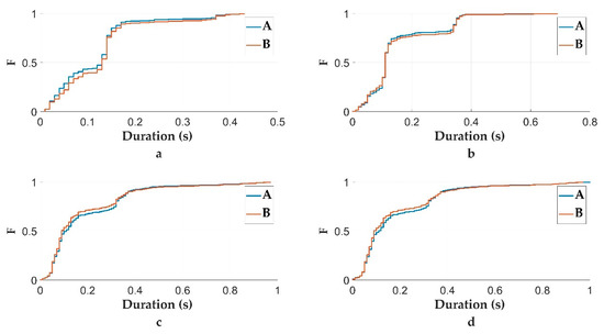 Cumulative distribution function, F, of the duration of voltage sags measured in 2014, 2015, and 2016 at sites #20: (a), #44: (b), #74: (c) and #75: (d), before time aggregation A, and after time aggregation B.