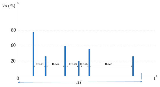 Let us assume that six voltage sags were measured in a generic site in a time period ΔΤ. Figure 11 shows the residual voltage, Vs, of these six voltage sags along the time axis; in Figure 11, the time that elapsed between every couple of voltage sags also is represented by the values of the variable ttne, i.e., from ttne1 to ttne5. If this site was characterized by the variable number of sags, the available value of this variable would be only one, equal to 6. Instead, if this site was characterized by ttne, the values available for this different random variable are 5, i.e., N−1, where N represents the number of voltage sags at that site.